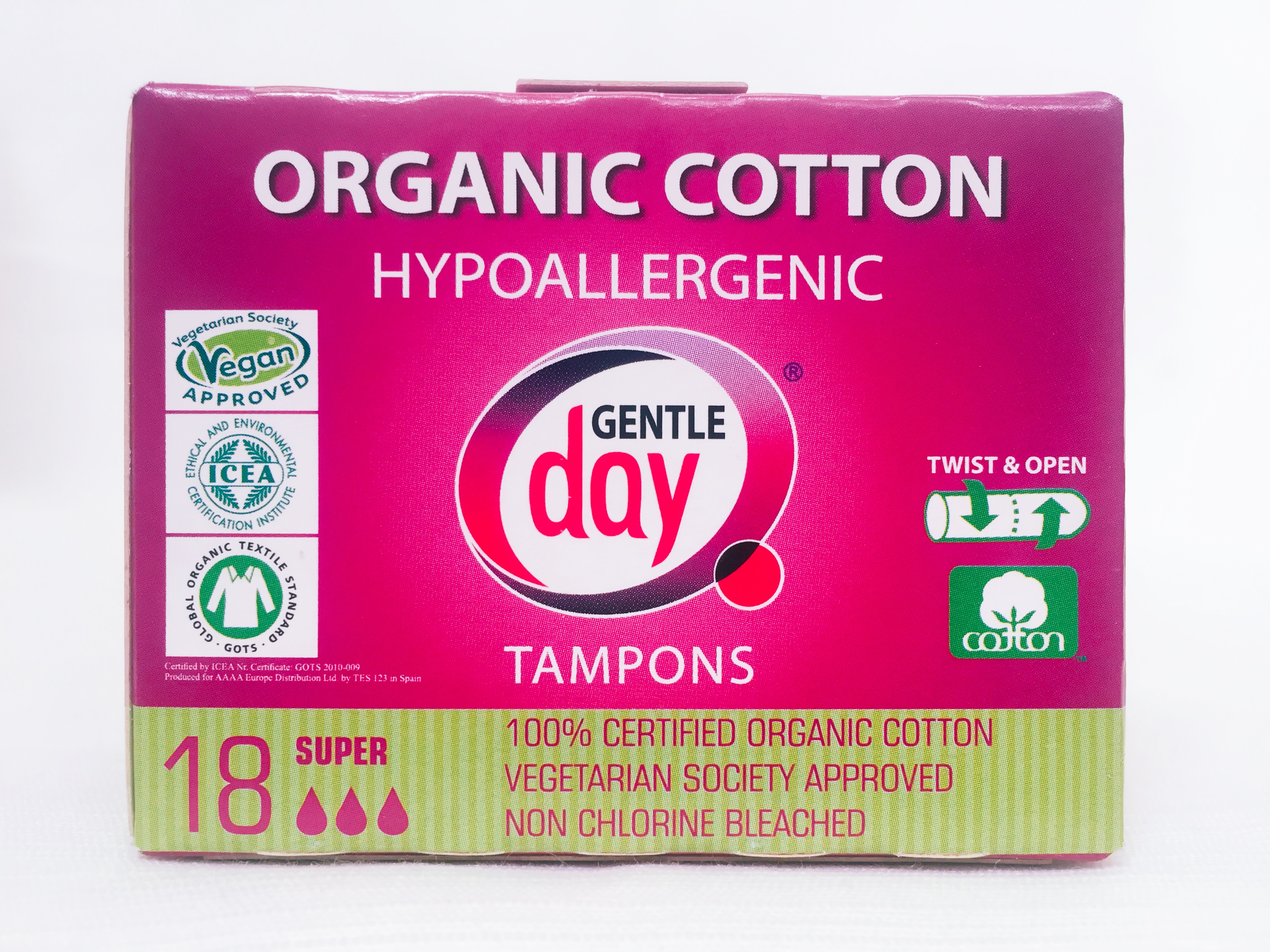 Tampóny Gentle Day® Super, 18 ks v balení, sú vyrobené zo 100 %organickej bavlny, ktorá je šetrná k vašej pokožke ako aj k prírode.