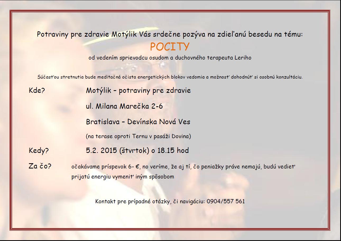 Stretnutie s Lerim vo štvrtok 5.2.2015 o 18:15hod na tému "Pocity". Pokúsime sa spolu porozumieť a lepšie spoznať sami seba a možno aj svoje okolie :)