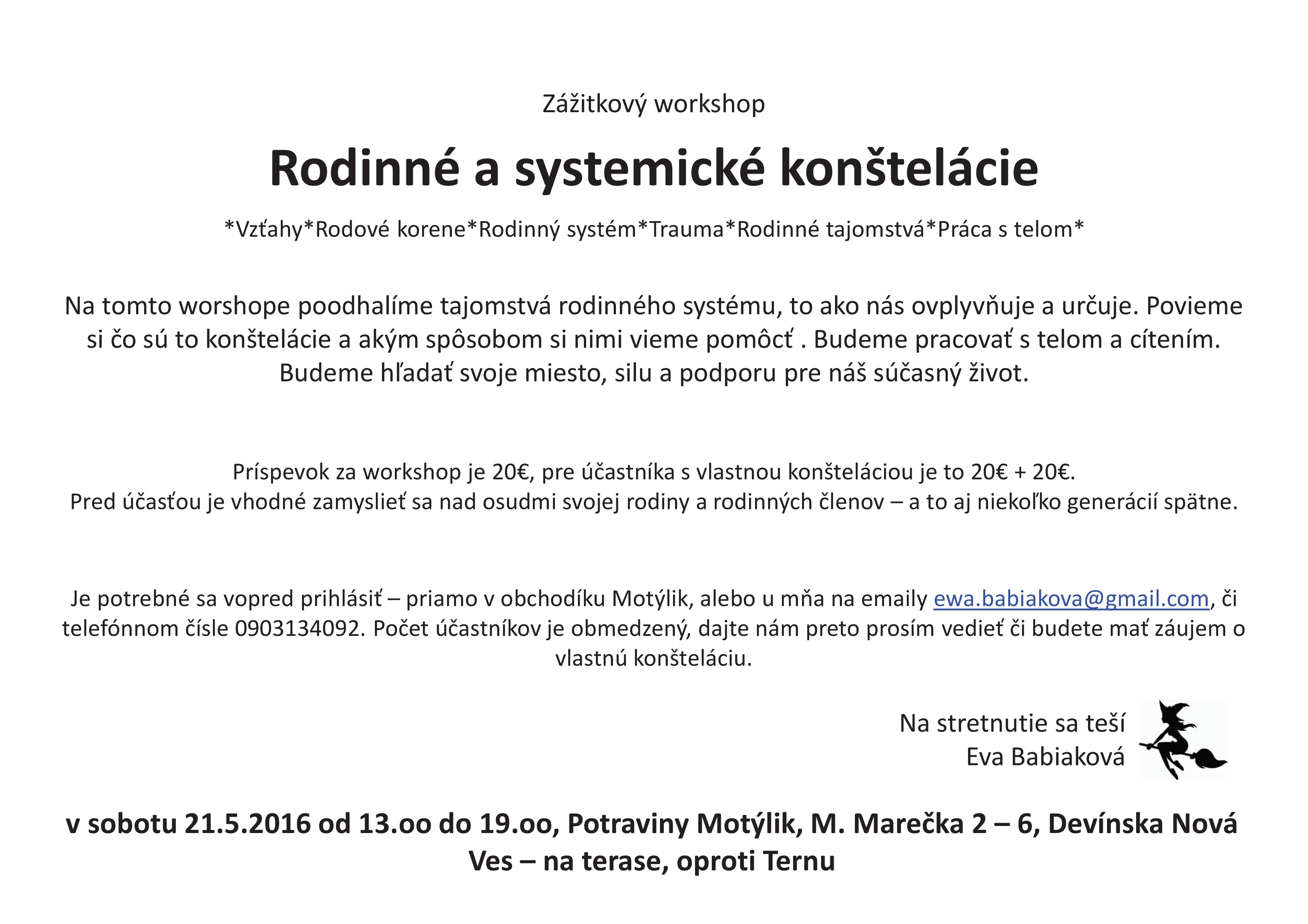Pozývame Vás zúčastniť sa rodinných a systemických konštelácií v priestoroch Motýlik v sobotu 21.5.2016 od 13:00 do 19:00hod. Počet miest je obmedzený, neváhajte sa u nás prihlásiť :)